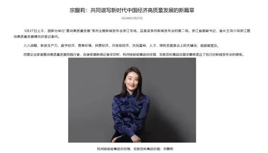 但是,今年3月27日,娃哈哈集团官网转载的一篇官方报道,宗馥莉的身份为“杭州娃哈哈集团总经理、宏胜饮料集团总裁宗馥莉”。