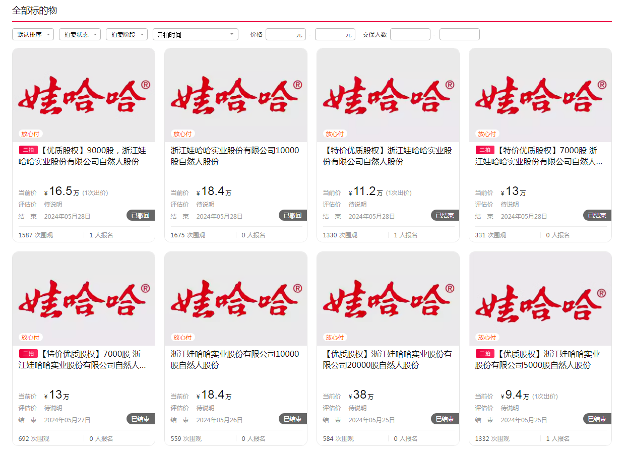 阿里拍卖平台显示,2024年,浙江娃哈哈实业股份有限公司的自然人股份出现近50次拍卖,从5000股到6万股不等,价格从9万多元到几十万元。