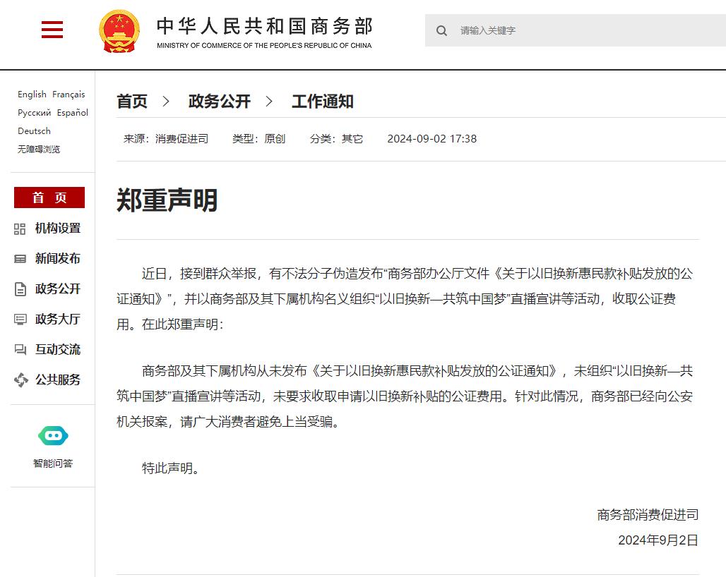 商务部:从未发布《关于以旧换新惠民款补贴发放的公证通知》