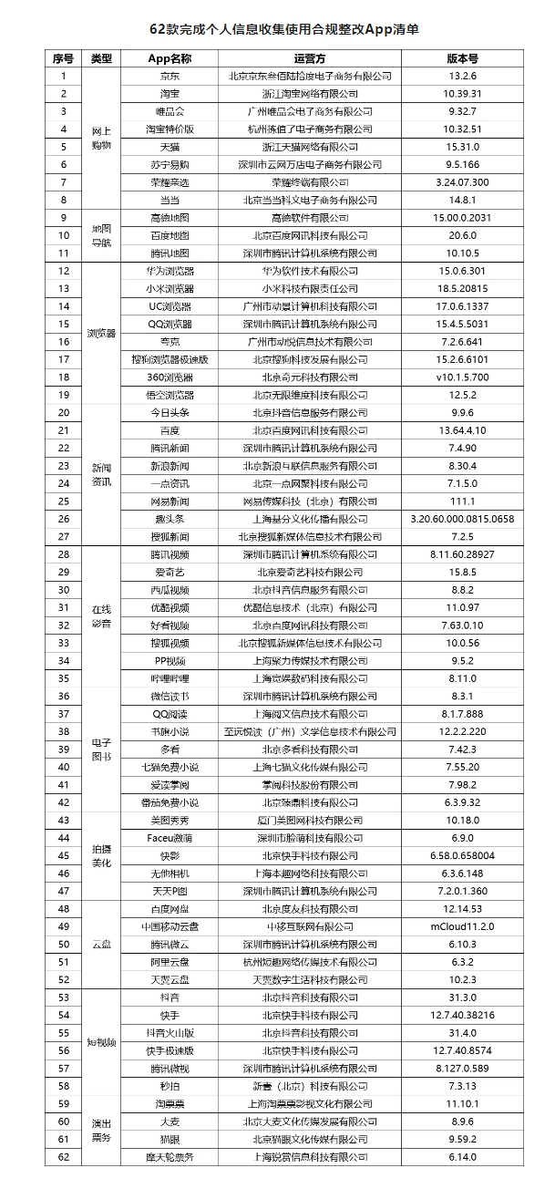 中国网络空间安全协会称,为规范App收集使用个人信息行为,保护个人信息权益,推动形成全社会共同维护个人信息安全的良好环境,中国网络空间安全协会组织指导网上购物、地图导航、浏览器、新闻资讯、在线影音、电子图书、拍摄美化、云盘、短视频、演出票务共10类62款App运营方,对照《中华人民共和国网络安全法》《中华人民共和国个人信息保护法》《常见类型移动互联网应用程序必要个人信息范围规定》等法律法规,重点针对超范围收集个人信息、过度调用敏感权限、权限设置和账号注销不便等个人信息收集使用问题完成了合规整改优化。
