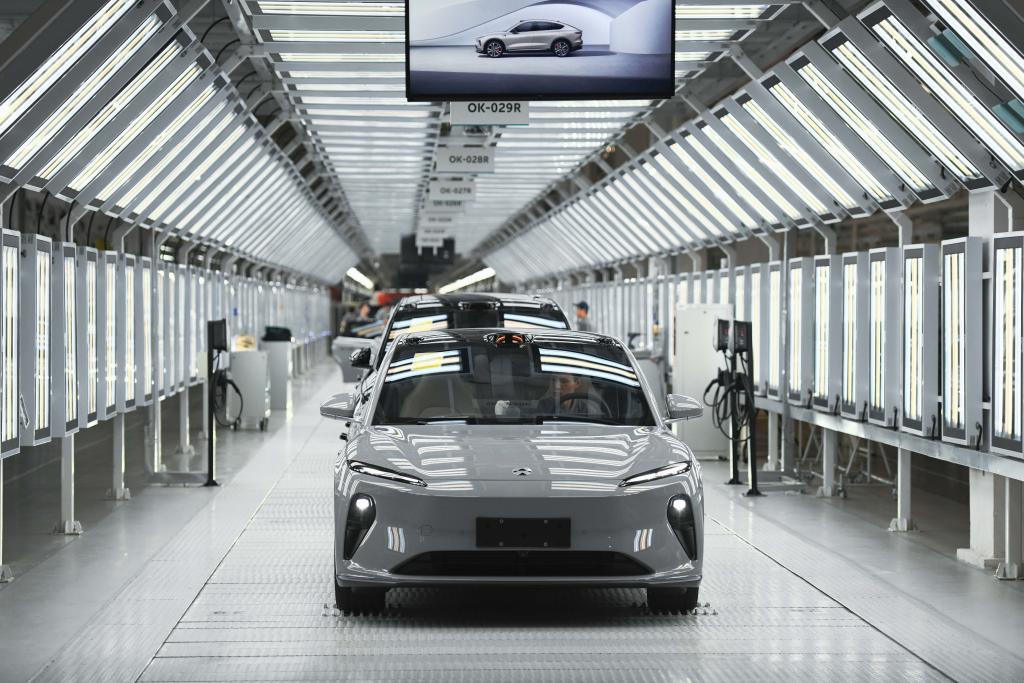这是安徽省合肥市新桥智能电动汽车产业园蔚来第二工厂内的新能源汽车生产线(5月9日摄)。新华社记者张端摄