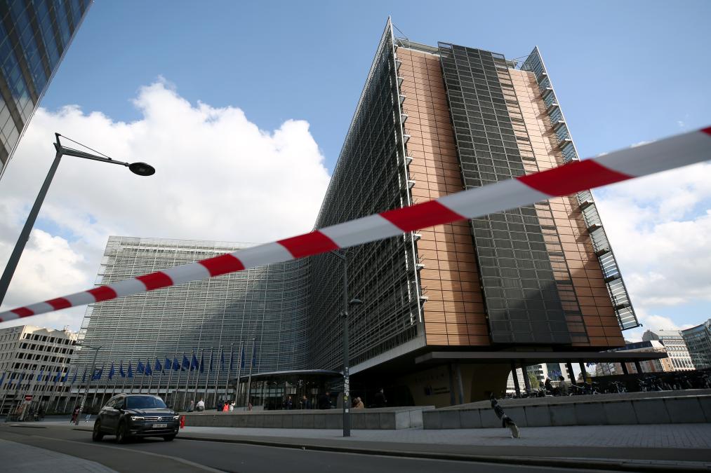 10月4日,在比利时布鲁塞尔,车辆驶过欧盟委员会大楼。新华社记者赵丁喆摄