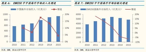 近几年,受到全球经济疲软和国际油价下跌等因素的影响,国际工程市场规模有所下降,而中国海外承包工程业绩逆势上升,市场份额不断扩大。2015年中国入选ENR250强的65家企业,海外市场收入936.74亿美元,同比2014年的896.7亿美元增长了4.46%,明显高于同期ENR250强全部海外市场收入-6.69%的增速。中国在ENR250强的海外市场份额由2012年的13.1%上升到2015年的19.3%,其中在亚洲、非洲等优势区域市场份额大幅提升,分别达到25%、54.9%。中国在ENR250入选的企业数量、海外营业额均位列世界第一。