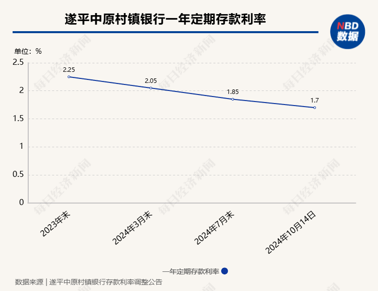记者注意到,部分银行年内已多次下调存款利率,例如,河南遂平中原村镇银行的一年期定期存款利率年初为2.25%,年内经过三次下调后,最新利率降至1.70%,较年初降幅达55BPs。