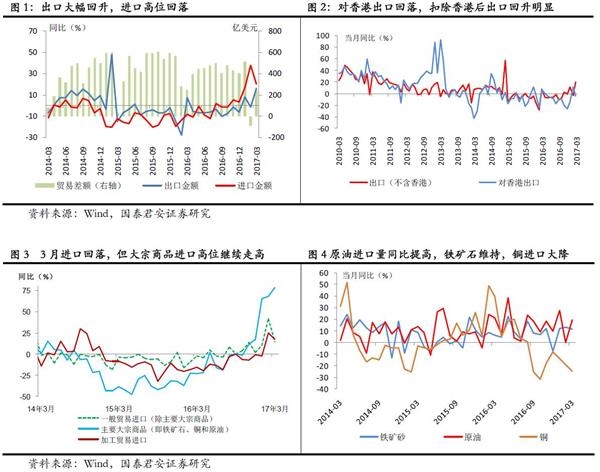 3月出口超预期增长16.4%,反映全球经济持续复苏(国君预期10%,市场预期4.3%),一季度出口增长8.2%,结束此前连续7个季度的负增长;季调后数据(同比16.9%)同样回升明显,结合欧元区PMI回升、经济数据向好,以及美国稳健的外围环境,维持全球经济复苏延续的判断。