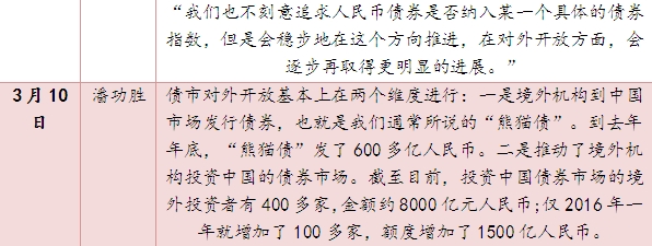 根据我们从3个角度的测算,我国债券市场对外开放吸引国际资本流入的规模可能达到年均1000亿美元,考虑到境外机构目前持有的在岸人民币债券规模仅为7835亿元(约合1100亿美元),未来前景广阔。继续推进债券市场对外开放的意义在于平衡我国跨境资本的流入流出,从而进一步为人民币汇率的稳定提供支撑;债市开放也为境外人民币构建了新的回流机制,有利于人民币国际化的深化;而境外投资者的参与也将丰富我国债券市场投资者的类型,促进我国债券市场进一步发展成熟。4月11日上午,李总理在中南海会见林郑月娥并任命其为新一任香港特首,并于会面中再次提及“债券通”。李总理表示将推出内地和香港之间的“债券通”,进一步密切内地与香港的交流合作,继续为香港发展注入新动能。而此前在两会结束后会见中外记者时,李总理首次提及将于今年推出“债券通”的计划,并称将进一步探索开放债券市场,这也将有利于维护香港国际金融中心的地位。