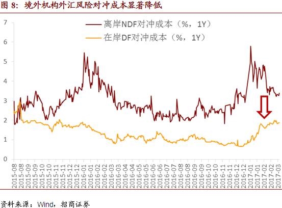 再次,包括离岸国债期货上市、开放在岸外汇衍生品市场在内的各项措施,使得风险管理工具不断丰富。早前港交所五年期中国财政部国债期货正式上市,可视为“债券通”正式开通之前的配套措施,将满足境外投资者管理人民币利率风险的需求,这也是首只在离岸市场交易的内地国债期货。此前也已对有关境外机构开放了在岸外汇衍生品市场,方便境外机构进行外汇风险对冲,相应的外汇风险对冲成本将显著降低(详见我们的前期报告《不积跬步无以至千里—评外管局对境外机构开放在岸外汇衍生品市场的新政》).