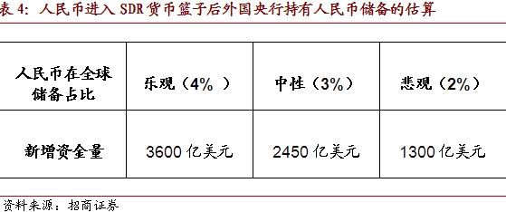 从人民币纳入SDR货币篮子的角度测算。人民币纳入SDR将在中期刺激外国央行和国际组织将人民币纳入其外汇储备资产,增加对人民币债券的配置需求。根据国际货币基金组织最新披露的数据看,日元和英镑在全球外汇储备中的比重分别是4.5%和4.7%,综合考虑人民币在SDR货币篮子中的权重等因素,我们预计未来5年,乐观估计人民币在全球储备资产中的占比可以达到4%,中性的预测达到3%,较为悲观的预测仅为2%。据此估算,未来外国央行持有的人民币资产最多将达到4600亿美元,较之目前1000亿美元左右的人民币储备资产存量,将为我国带来3600亿美元的资本流入,年均达到720亿美元。而事实上,该估算规模仍低估了境外机构对人民币债券的购买力,因为我们仅仅考虑了境外央行调整其外汇储备资产的币种结构,并未包含其他类型的境外机构对人民币债券的配置需求。