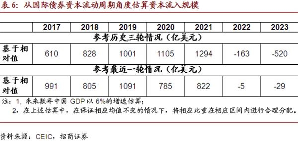 最后,在我们前期的报告《从国际经验看中国债券市场未来的国际资本流入形势》中,我们从国际债券资本流动周期的角度,对我国债券市场开放之后国际资本的流入规模进行了测算。以去年为新一轮周期的开端,则未来5年间中国债券市场将吸引4500-4800亿美元的国际资本流入,年均近1000亿美元。