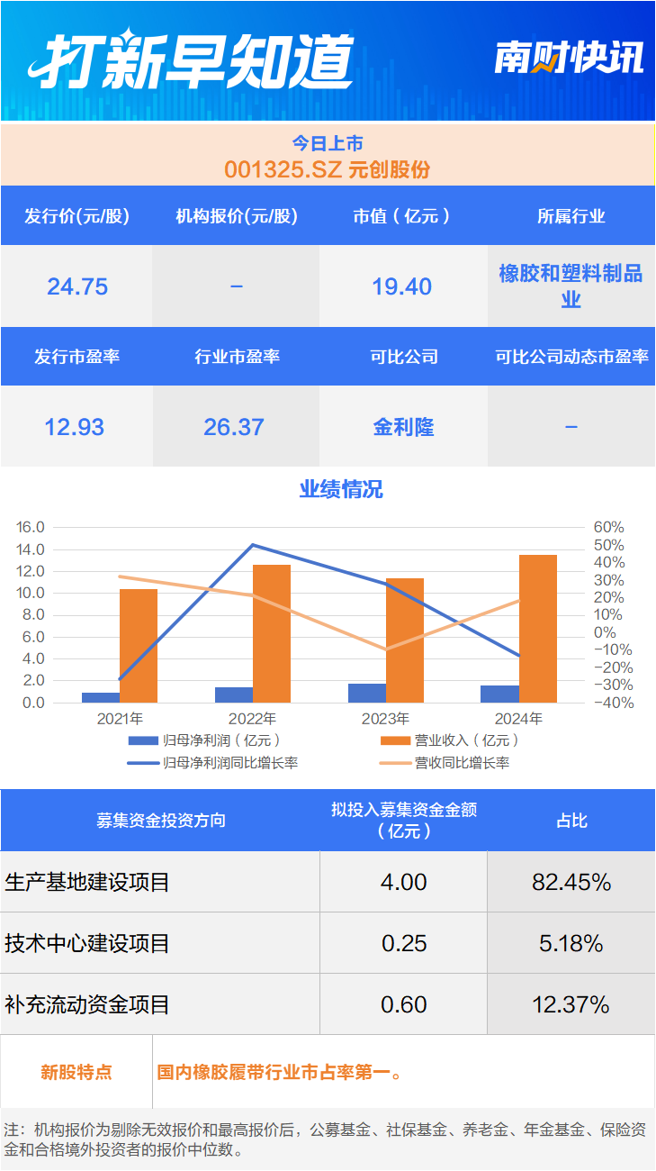 12月18日,有一只新股上市,为深市主板的元创股份(001325.SZ)。该公司主营橡胶履带类产品的研发、生产与销售,主要产品包括农用机械橡胶履带、工程机械橡胶履带和橡胶履带板。产品作为联合收割机、挖掘机、装载机、摊铺机等多种履带式农用或工程机械的行走部件,最终应用于农业生产、工程施工等不同应用领域。
