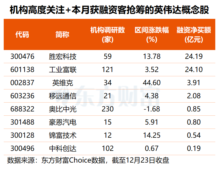 值得一提的是,上述17只机构高度关注的英伟达概念股中,有4股本月获融资客大举抢筹,其中,胜宏科技、工业富联融资净买额均超24亿元,英维克获杠杆资金加仓3.91亿元,移远通信也获融资净买入2.08亿元,奥比中光、豪恩汽电锦富技术的融资净买额均在5000万至1亿元之间。
