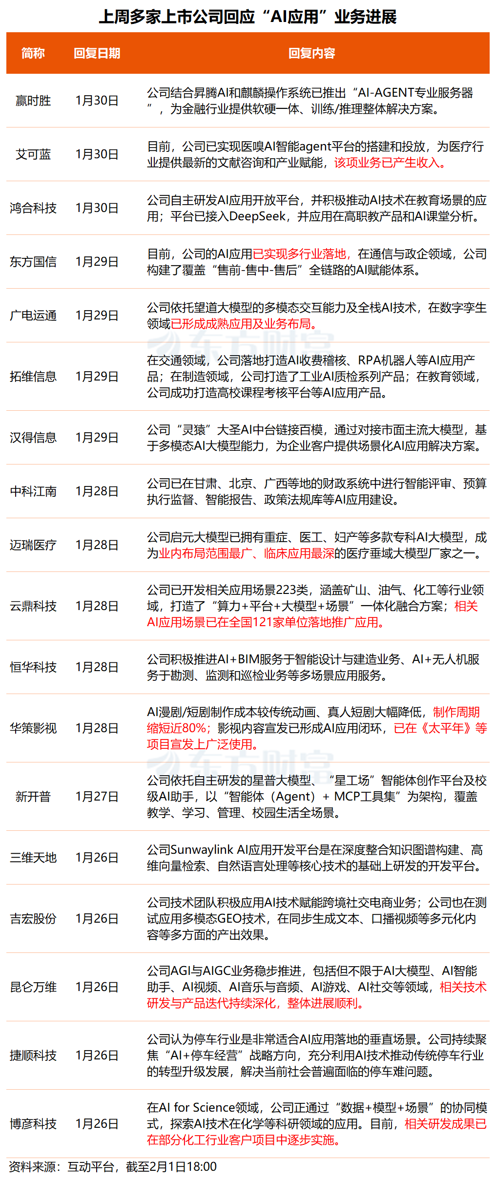 据东方财富不完全统计,上周有多家上市公司在互动平台对AI应用相关提问进行了回复: