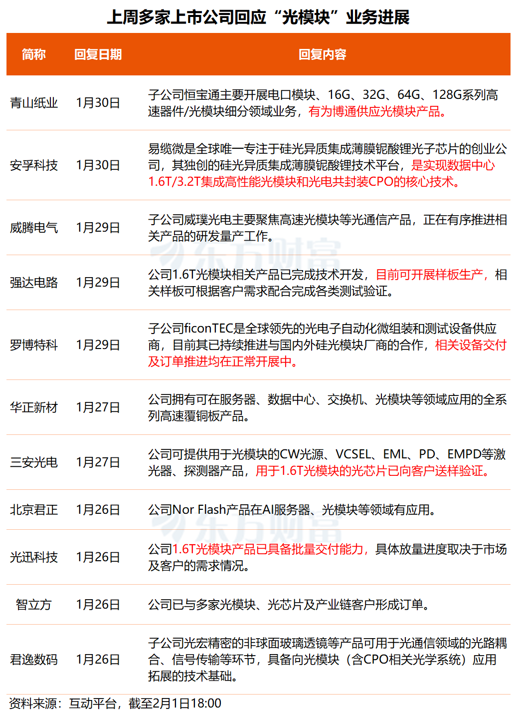 关于光模块概念,上周也有多家上市公司在互动平台进行了相关回复: