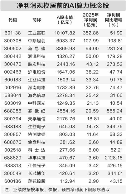 14只概念股净利润达到10亿元以上,如工业富联、中际旭创、新易盛、润泽科技、胜宏科技等。