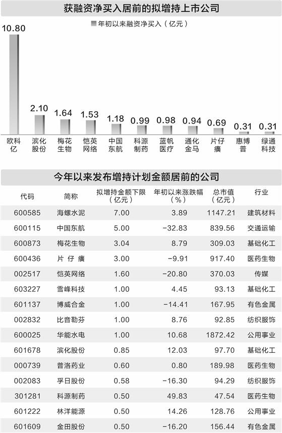 发布增持计划的公司受到融资资金青睐。统计显示,年初以来发布重要股东增持计划的公司获融资净买入金额达到6.58亿元;16家获得融资净买入,欧科亿、滨化股份、梅花生物、恺英网络、中国东航5家净买入金额均超过1亿元。
