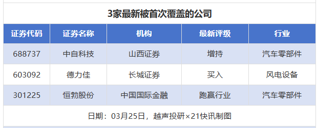 首次覆盖方面,3月25日券商共给出了3次首次覆盖,其中中自科技获得山西证券给予“增持”评级,德力佳获得长城证券给予“买入”评级,恒勃股份获得中国国际金融给予“跑赢行业”评级。