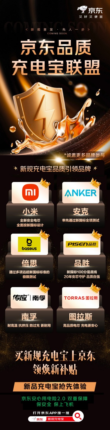 为进一步保障消费者权益,京东第一时间与小米、安克、倍思、品胜等品牌发起“品质充电宝联盟”,推动联盟内产品全面按新国标生产;同时推出“安心用电2.0服务”,若消费者因充电宝无法登机,可立即在京东申请退换,全方位缓解出行顾虑,筑牢消费保障防线。