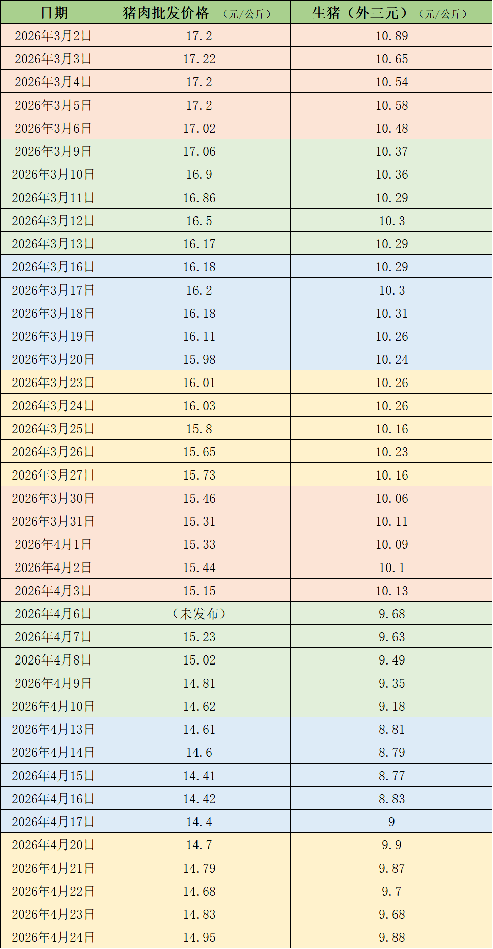 摘要:  据农业农村部监测,4月24日,全国农产品批发市场猪肉平均价格为14.95元/公斤,与上周五(4月17日)的14.4元/公斤相比,上涨3.8%。本周的平均价格为14.79元/公斤,与上周14.49元...