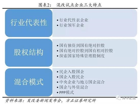 前两批19家试点企业有三大特点:1)从行业代表性看,试点企业都是本行业的代表企业或领军企业,具有典型性能够发挥示范作用;2)从股权结构看,试点企业混改后股权结构都将发生质的变化,有的从国有独资改为国有绝对控股,有的从国有绝对控股改为国有相对控股,有的探索国家特殊管理股制度;3)从混合模式看,包括民企入股国企、国企入股民企、中央企业与地方国企混合、国企与外资混合、PPP模式等,各有特色。