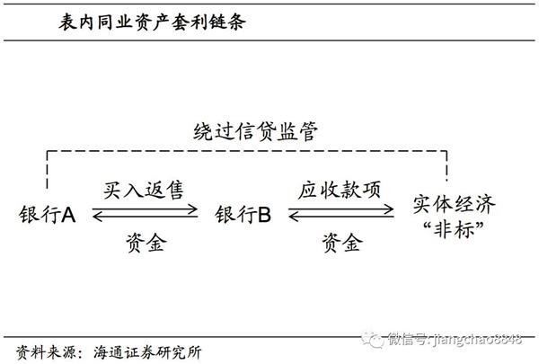 13年典型的表内同业套利链条是:银行A通过买入返售资产,将资金给银行B,银行B利用这笔资金表内配置非标资产(一般可按照分类,计入应收款项类、可供出售类或交易性资产)、负债端增加卖出回购。本质是银行A承担非标资产的风险与收益,而银行B作为通道从非标收益中“分一杯羹”。