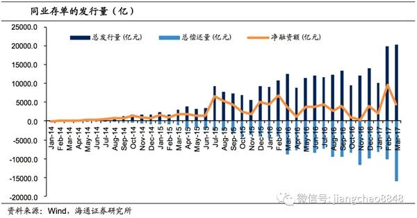 自13年末至今的3年多来,同业存单规模不断发展扩大,特别是2015年中期以来,随着发行人范围不断扩大,同业存单的发行井喷式增长。数据显示,同业存单的单月发行规模从2015年6月的2616亿,增加到2017年3月的超过2万亿,当月净融资量也大幅增加,从过去的300亿左右,到17年2月净融资9500多亿。