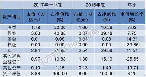 东方财富Choice数据显示,截至2017年一季度末,公募基金的资产规模为8.88万亿元,较2016年末的8.60万亿元环比增加了3.25%。(注:汇总中的资产净值和资产总值,均剔除了ETF联接基金公告投资基金的资产)