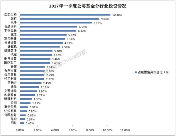 在股票资产中,公募基金今年一季度投资占比最高的为医药生物板块。2017年一季度基金公司持有医药生物板块的流通股市值为870.16亿元,占股票投资市值比例的10.30%。不过,医药生物板块在基金的股票资产占比中有所下降。