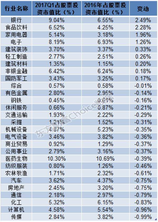 对比2017年一季报和2016年年报来看,公募基金一季度在银行、食品饮料和家电等行业的投资比例有较大幅度的提升,分别较去年末提高了2.49、2.28和1.96个百分点。
