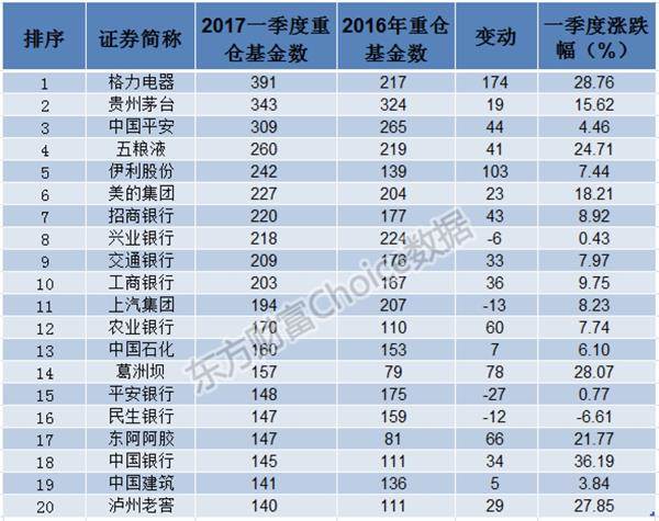 从个股来看,截至2017年一季末,重仓格力电器的公募基金数量最多,达到391只。对比2016年末可发现,今年一季度,重仓格力电器的公募基金数量骤增了174只。