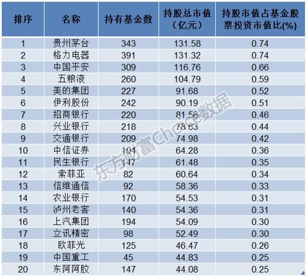 从下表中可知,在一季度公募基金持股市值最多的前20只股票中,大多是大盘蓝筹股以及白马股。
