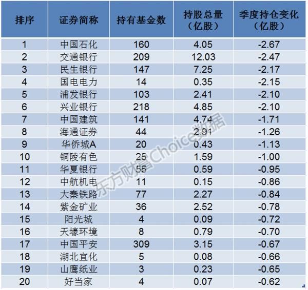 今年一季度被公募基金减持最多的个股为中国石化,该股合计被公募基金减持2.67亿股。此外,交通银行、民生银行、海通证券等金融板块个股也是公募基金重点减持的对象。
