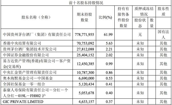 贵州茅台前十名股东持股情况。