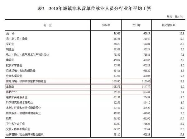 根据国家统计局发布的2015年数据,不论是私营单位还是非私营单位,金融业,信息传输、软件和信息技术服务业及房地产业的年平均工资均占据前几位。其中,2015年非私营单位年平均工资最高的是金融业,为114777元,私营单位年平均工资最高的是信息传输、软件和信息技术服务业,为57719元。