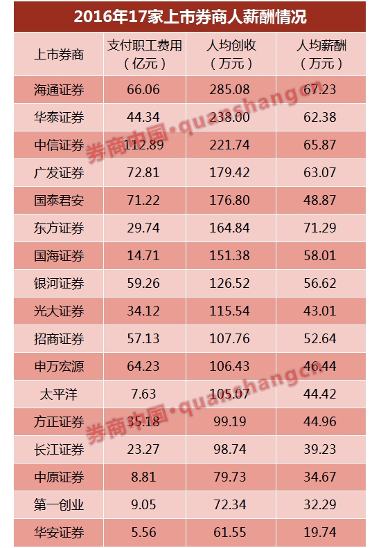 据券商中国报道,2016年已公布年报的17家券商中,去年发放人均薪酬52万,其中东方证券人均71.29万最高,排在第二位的是海通证券人均67.23万,第三的是中信证券65.87万。