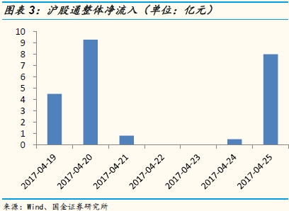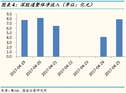 沪股通与深股通总体净流入。本期(0419-0425)沪股通净流入23.12亿(上期净流出9.25亿),深股通净流入34.53亿(上期净流入8.51亿);合计净流入57.65亿(上期净流出0.74亿).