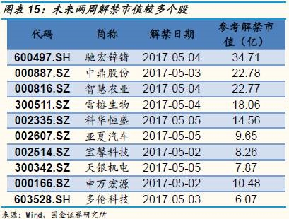潜在解禁资金方面:本周(0424-0430)市场将迎来约349.22亿解禁压力,下周(0501-0507)、下下周(0508-0514)市场将分别迎来160.27、715.21亿的潜在解禁压力规模。下周定增解禁规模约为127.50亿。解禁个股方面,未来两周解禁市值(绝对额)较大的个股:驰宏锌锗、中鼎股份、智慧农业、雪榕生物、科华恒盛等。