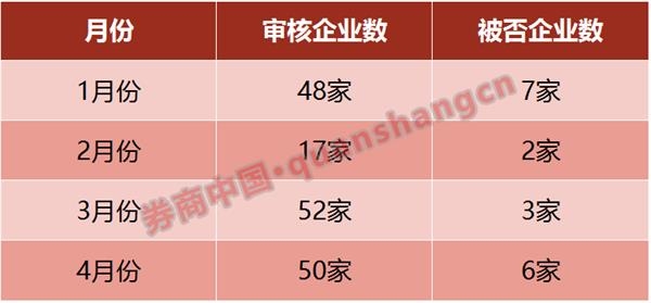 进入4月份,在原来每周两次的审核节奏上,证监会发审委的工作时间增加至每周三次,一周审核企业数在13-15家左右,在审核速度加快的同时,被否企业数也在增加,企业过会率降至新低。
