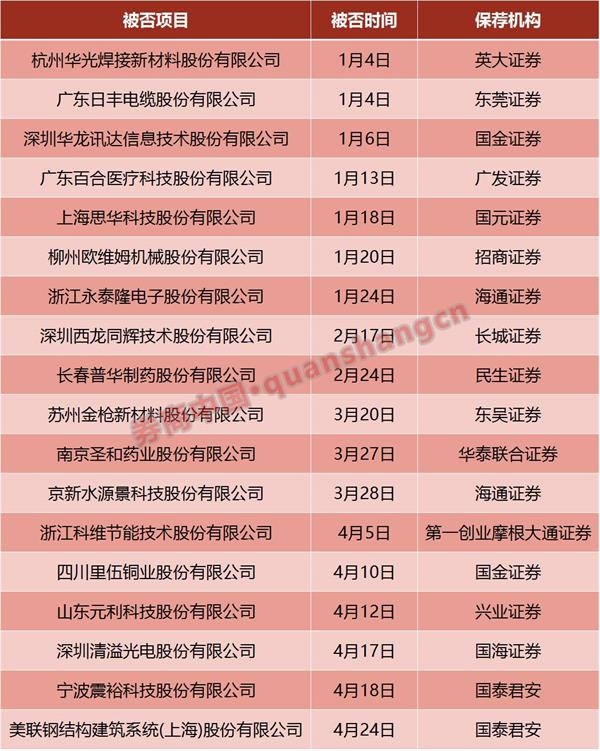 梳理今年以来被否的18个项目,国金证券、海通证券、国泰君安证券分别连续两次“中招”,其中,国泰君安保荐项目一周被否两家,分别为宁波震裕科技股份有限公司和美联钢结构建筑系统(上海)股份有限公司。