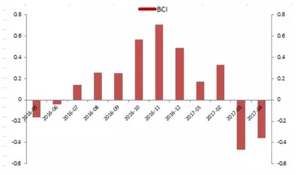 郭磊比较关注的另一个指标──生意社BCI,在2016年7月至2017年2月处于扩张期,2017年3月为-0.47,2017年4月为-0.36,整体指向是已经度过景气区间。
