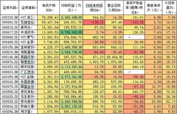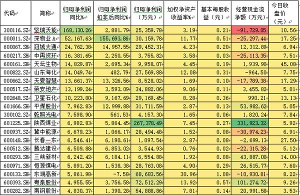 上表是营业收入同比增长幅度最大的20家公司,营业收入增长是公司盈利增长的基本条件,正常情况下,营业收入的增长都会带来利润的增长。当然,由于重组并购等因素也会出现营业收入增长大大快于净利润的情况。所以将二者对照着看,更能了解上市公司经营的真实情况。
