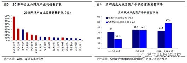 三四线已成为我国重要的消费品市场。三四线城市的消费升级体现在很多方面,从地产市场角度看,三四线地产市场持续火热。截至2017年3月,30个大中城市商品房成交面积同比增速已经降至-23.5%,但全国商品房销售面积同比增速19.5%,说明在三四线地区地产销售形势仍然较好。17年一季度珠三角地区的惠州、珠海、佛山、江门,长三角附近的嘉兴、湖州、镇江,以及中部城市如六安、孝感等三四线城市都出现了房价快速上涨的现象。改善型住房需求是推动这一轮三四线地产销量高增长的重要原因,地产企业碧桂园一直将市场瞄准三四线城市居民的住房改善需求,主要提供三四线城市的高档住宅。2016年以来,碧桂园业绩增长显著,高档住宅在三四线城市受欢迎,反映居民住房需求已经从解决刚需转向注重房屋品质。在网购、电子产品、汽车、家电家装等领域,三四线城市也已经成为我国重要的市场。网购方面,根据洋码头统计数据, 2016H1三线城市海外购的增速为108.6%,超过一线城市增速的77.6%。电子产品方面,三四线城市成为国产品牌的重要市场。OPPO手机销量中一二线城市销量仅占17.5%,而三线城市占比34.7%,四五线城市占比47.8%。自主品牌汽车方面,根据汽车工业协会公布的数据显示,2017Q1大部分汽车销量下滑,如福特汽车一季度在中国销量下滑19%,大众汽车同比下滑幅度为6.7%,但我国SUV车型仍维持了21%的较高销售增速,其中主要为我国自主汽车品牌,如吉利、传祺、荣威、众泰、长城等自主品牌正在加速抢占份额,三四线城市正是这些自主品牌SUV汽车的重要市场。三四线城市消费在我国整体消费升级中重要性不断凸显,主要源于近几年三四线城市在收入、基础设施条件、人口和产业趋势、以及商业环境等方面的一系列变化。