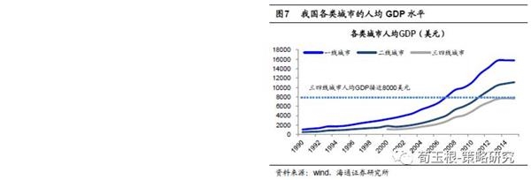 三四线城市人均GDP迈过拐点,消费需求爆发。截至2015年末,我国一线、二线、三线、四线、五线及以下地区人口占比分别约为6%、19%、21%、32%、22%,其中一线至四线城市人均GDP分别在1.6万美元、1.1万美元、9000美元、6000美元左右。我国一线、二线城市人均GDP已经超过和接近1.2万美元的水平,逐渐进入以第三产业为主导的发展阶段。我国的三四线城市平均人均GDP也已经超过6000美元的拐点,也已经进入消费服务业快速发展的产业结构转换阶段。收入水平迈过拐点是三四线城市消费服务业迎来快速增长的重要基础。
