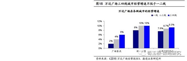 商业渠道积极下沉,挖掘三四线市场。三四线城市人均GDP水平越过拐点说明三四线已经具备较强的消费实力,而城市群快速发展、人口回流、产业向三四线转移等各方面的变化,也给三四线城市商业发展带来更新的机遇和空间。三四线城市的巨大消费潜力,吸引了如京东、万达、星巴克等各类商贸零售和休闲服务企业的渠道下沉。京东超市2017年的发展战略提出深入布局三四线城市,并计划3年内在全国共开设5000家母婴消费体验店,重点覆盖三四线城市。万达集团截至2016年底已开业购物中心项目有183座,其中三线以下城市的购物中心超过84家,2017年万达计划再新开业50座万达广场,其中大部分位于三四线城市。根据万达的经营报告,三四线城市的万达广场在客流、销售增速等方面的经营效益与一二线持平甚至更好。星巴克从2011年开始开拓三四线市场,目前已经进入了如珠海、佛山、福州、东莞、中山等23个三四线城市。家具龙头企业索菲亚更是很早就已经开始布局三四线城市,截至2016年底索菲亚四五线城市门店数占比51%,并计划未来再新开200-300家门店,下沉销售网络至四、五线城市。