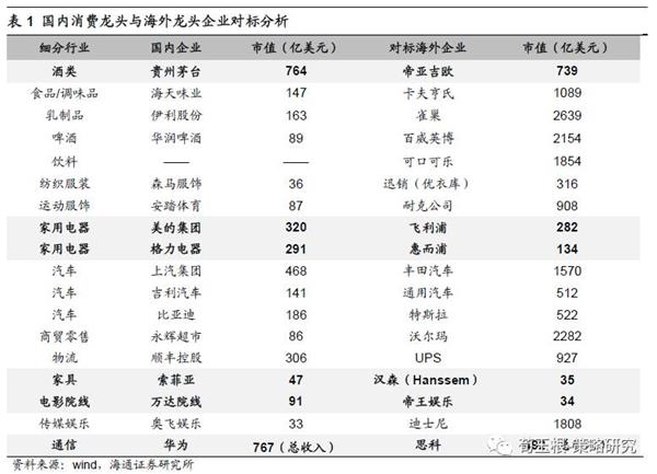 我国品牌企业规模仍相对较小。我国大部分龙头企业与相应的海外企业相比规模仍然明显较小,国内仅有白酒、家电、通信、家具、电影院线等行业的龙头市值超过海外相应上市公司,具体如贵州茅台市值764亿美元,已经超过全球最大酒类公司帝亚吉欧市值739亿美元;国内家电龙头格力、美的市值达到300亿美元左右,超过海外家电企业飞利浦、惠而浦;国内通信行业龙头华为2016年营收达到767亿美元,超过思科492亿美元等。但我国其他大部分消费龙头市值规模与国际企业相比差异巨大,仍处于发展初期段,如国内乳制品龙头企业伊利股份市值163亿美元,较国际乳制品龙头雀巢市值2639亿相去甚远,国内汽车龙头企业上汽、吉利市值分别为468亿、141亿美元,相对丰田1570亿和通用汽车512亿美元市值仍然差异也较大。在动漫产业领域,我国本土动漫龙头企业奥飞娱乐市值仅33亿美元,相对美国传媒巨头迪士尼而言还处于发展初期阶段。从中美两国消费龙头在所有上市公司中市值占比的角度看,美国消费品巨头如可口可乐、迪士尼、强生、宝洁等企业最高市值占比均达到1%-1.6%之间,国内仅有白酒企业如茅台、洋河、五粮液以及上汽集团的市值占比超过1%,其他大部分消费类企业市值占比仍然较低。