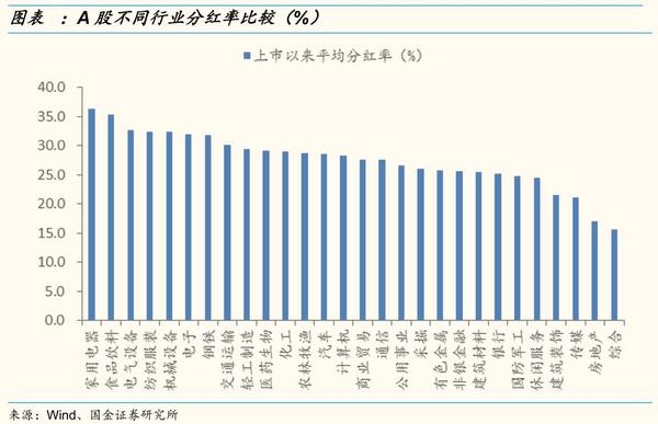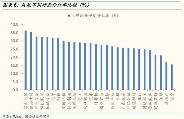 其他行业中,电气设备、纺织服装、机械设备、电子和钢铁行业分红率也较大,上市以来分红率分别为36.25%、35.30%、32.61%、32.31%、32.29%、31.95%、31.7%。