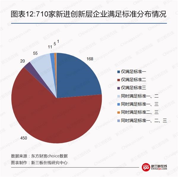 新三板在线研究中心对710家新晋创新层企业进行分析,满足分层准入标准二的挂牌公司占比最大,达72%,总数有最511家。显然,对于创新层新生来说,高成长是其最大的优势。