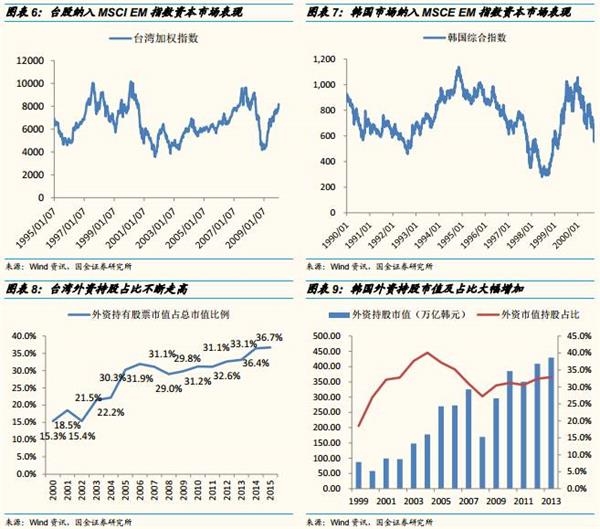1)台湾:从1996年4月2日首次传出台股将纳入MSCI新兴市场指数到9月3日正式纳入,台湾股市出现一波上涨,涨幅为20.9%;1996年首次纳入和2005年全部纳入后,台湾股市均出现了一波上涨。台湾市场纳入MSCI EM指数短期来看对市场有提振作用。长期来看,台湾市场纳入MSCI推动了国际资金配置台湾市场。从台湾市场纳入MSCI以来,外资持股市值占总市值比例从2000年来逐步提高,2015年达到36.7%,是2000年的1.4倍。