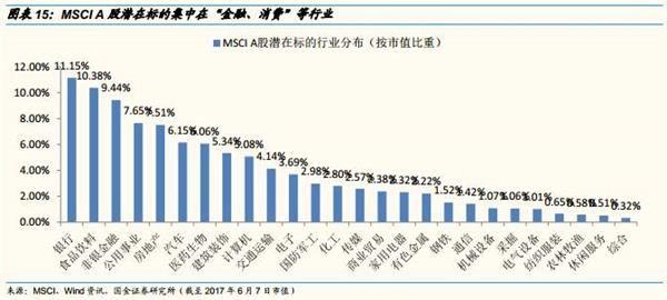 MSCI纳入A股潜在标的集中在“消费、金融”等行业。按照MSCI3月27日公布的问询方案,按市值(截至2017年6月7日)测算行业分布:银行占比11.15%,食品饮料占比10.38%,非银金融占比9.44%,分列前三位,此外占比较高的行业还有:公用事业、房地产、汽车、医药生物、计算机等。按板块来看,金融板块和消费板块是占比较大的两个板块,分别占比为20.59%和18.85%。