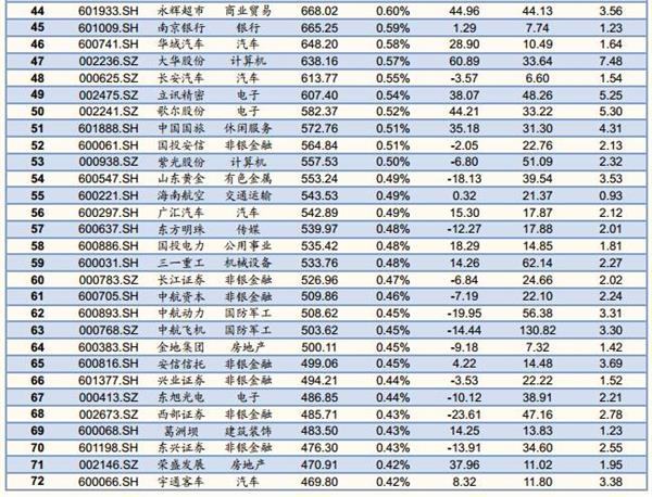 MSCI潜在标的前十大权重股分别是:贵州茅台(5.16%)、浦发银行(3.23%)、上汽集团(3.14%)、兴业银行(3.05%)、长江电力(2.91%)、中国建筑(2.59%)、海康威视(2.44%)、美的集团(2.24%)、五粮液(1.73%)、招商蛇口(1.49%)、国泰君安(1.45%)等。完整169支成分股列表如下。