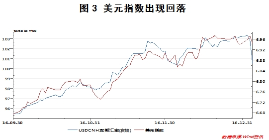 二是美元高位回落,降低人民币贬值压力。近期,国际市场处于特朗普上台前的观望状态,美元指数有所回落。历史数据显示,人民币汇率走势与美元指数走势高度相关(参见图3).Wind数据显示,1月5日,美元指数连续两个交易日大幅回落,最低降至101.72,最大回落幅度达到2个百分点。美元的回落导致人民币贬值压力减轻。